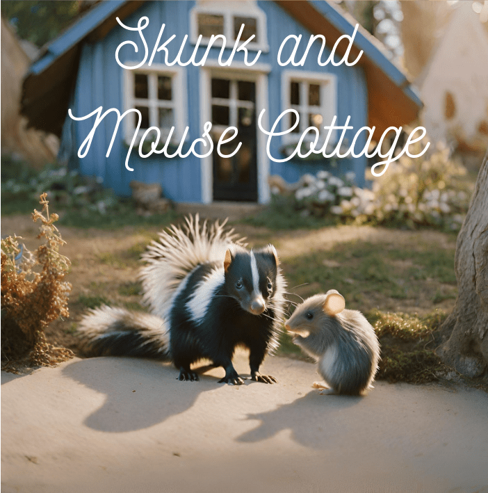 I live in a very small suburban house that looks just like every other mini house on my street. In order to make myself feel better, I decided to call it a cottage, because it just sounds fancier. I read somewhere that people sometimes named their cottages after animals in the area. Well, let’s face it: the two most active species in my area are mice and skunks. And so, Skunk and Mouse Cottage it was.